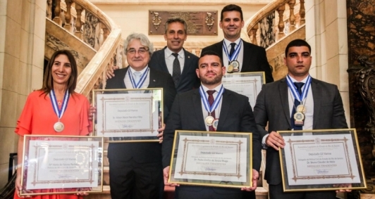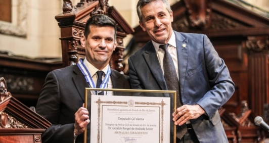 O diretor do 6° Departamento de Polícia de Área (6°DPA) de Campos, Geraldo Rangel, além dos dois delegados titulares do município, Pedro Emílio Braga, da 146ª Delegacia de Polícia (DP) de Guarus e Bruno Cleuder, da 134ª DP do Centro, receberam nessa quarta-feira (13) na Assembléia Legislativa do Rio de Janeiro (Alerj), a medalha Tiradentes.