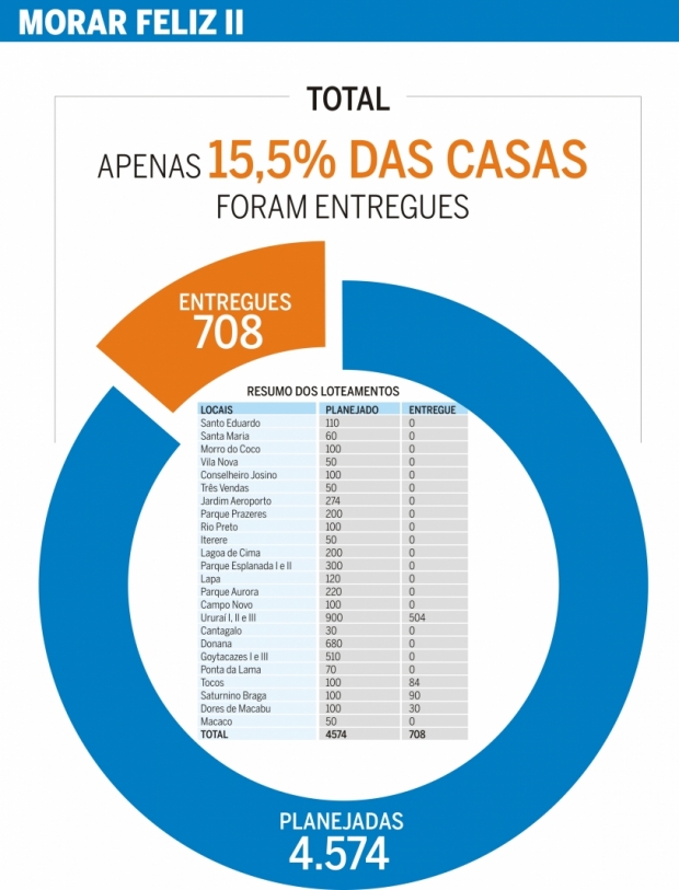 De acordo com relatório de uma auditoria interna realizada pela Prefeitura de Campos em 2017, apenas 31,1% das casas populares planejadas para a segunda fase começaram a ser construídas, porém, apenas 15,5% foram concluídas e entregues à população. De todas as 24 localidades que receberiam os conjuntos habitacionais, somente Ururaí, Tocos, Saturnino Braga e Dores de Macabu.