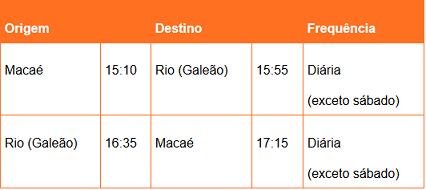 A Gol anunciou a rota Macaé X Rio e já abriu a venda de passagens em seu site. Os voos que ligarão o aeroporto de Macaé até o do Galeão, no Rio, começarão no dia 03 de fevereiro e serão diários, com exceção dos sábados. A companhia aérea fez um acordo com a VoePass (antiga Passaredo) para usar as suas aeronaves na rota.