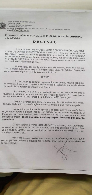 Na quinta-feira (19), o desembargador Werson Rêgo negou o pedido da Prefeitura de Campos, mantendo a decisão do juiz Heitor Campinho, da 5ª Vara Cível do município, que, em ação movida pelo Siprosep, tinha mantido para a última sexta-feira (20) o pagamento integral do 13º salário de 2019, entretanto, decisão não foi cumprida no dia 20.