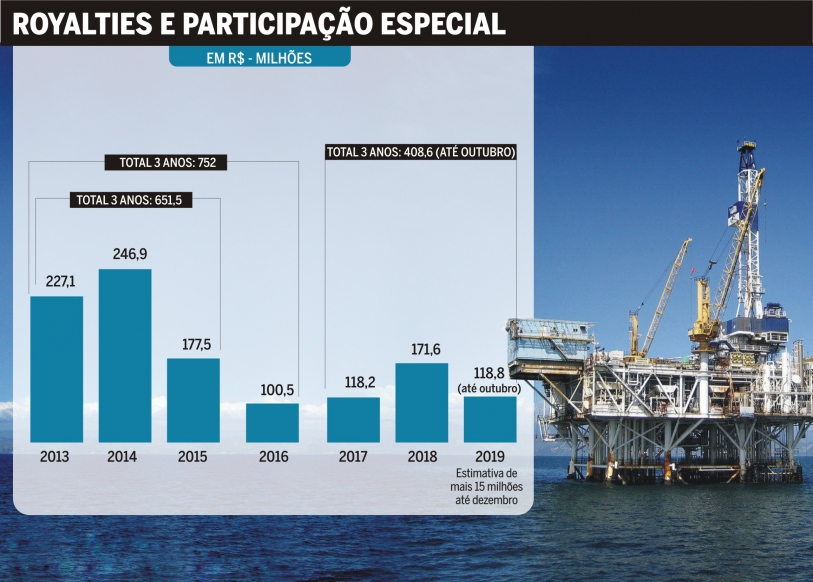 Este ano, até outubro, SJB arrecadou R$ 118,8 milhões de royalties e participações especiais. Se for confirmada a estimativa de fechar 2019 com mais R$ 15 milhões, o total dos três anos do governo Carla Machado será de R$ 423,6 milhões. Nos três primeiros anos da gestão anterior, de 2013 a 2015, os royalties e participações especiais somaram R$ 651,5 milhões.