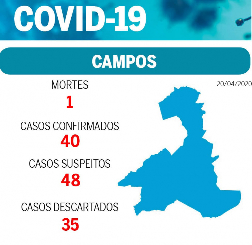 Primeiro óbito - A primeira morte em decorrência da Covid-19 em Campos foi confirmada no dia 10 de abril. O caminhoneiro Hudisson Pinto dos Santos, morador da Penha, de 39 anos, casado e pai de dois filhos, morreu na UTI do Centro de Controle e Combate ao Coronavírus (CCC). Hudisson esteve na UPH do São José no dia 4 de abril. Em seguida, fez uma tomografia no Hospital Geral de Guarus (HGG), de onde foi transferido direto para UTI do CCC, falecendo seis dias depois. O caminhoneiro havia passado por São Paulo e Ceará, duas áreas de grande circulação do vírus.