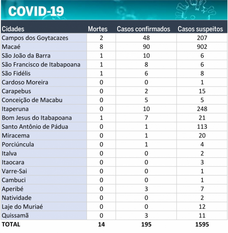 Subiu para 14 mortes e 195 o número de casos confirmados de coronavírus no Norte e Noroeste Fluminense nesta sexta-feira (24). Foram 14 novos diagnósticos positivos e um óbito em 24 horas na região, que foi registrada em São Fidélis. Em Macaé, mais nove pacientes testaram positivo para a doença, totalizando 90 infectados. Também foram contabilizados pacientes positivos para Covid-19 em Campos (2), São João da Barra (1) e São Francisco de Itabapoana (1).
