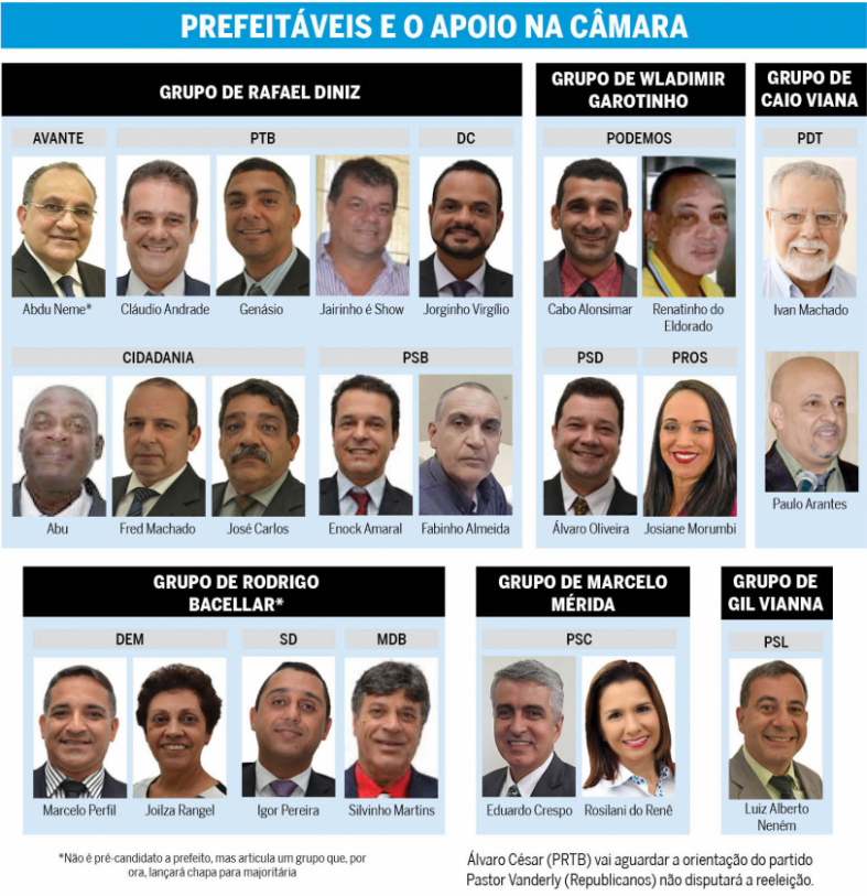 O grupo de Rafael Diniz (Cidadania), natural candidato à reeleição, tem 10 nomes no Legislativo. Na sequência aparecem os grupos de Wladimir Garotinho (PSD) e Rodrigo Bacellar (SD), com quatro cada. O PDT do pré-candidato Caio Vianna ficou com dois nomes na Casa, mesmo número do PSC, de Marcelo Mérida. Para completar a lista, o PSL de Gil Vianna passou a ter um representante na Câmara.