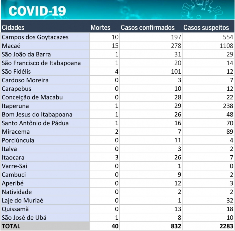 Em todo Norte e Noroeste Fluminense, foram confirmados casos em: Macaé (278), Campos (197), São Fidélis (101), São João da Barra (31), Itaperuna (29), Conceição de Macabu (28), Bom Jesus do Itabapoana (26), Itaocara (26), São Francisco de Itabapoana (20), Santo Antônio de Pádua (16), Quissamã (13), Aperibé (12), Porciúncula (11), Carapebus (10), São José de Ubá (8), Miracema (7), Cambuci (9), Cardoso Moreira (3), Italva (3), Natividade (2), Laje do Muriaé (1) e Varre-Sai (1).