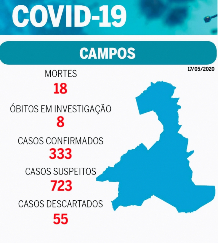 Na última sexta-feira (15), Campos contabilizou quatro mortes por coronavírus. De acordo com a Vigilância e Saúde, foram três idosos, de 68,73, e 76 anos, e uma mulher de 37, e todos apresentavam comorbidades. A Prefeitura informou, ainda, que a morte confirmada neste sábado é de um homem de 64 anos.
