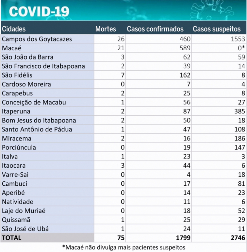 Em todo Norte e Noroeste Fluminense, foram confirmados casos em: Macaé (589), Campos (460), São Fidélis (162), Itaperuna (87), São João da Barra (62), Conceição de Macabu (56), Bom Jesus do Itabapoana (50), Santo Antônio de Pádua (47), Itaocara (44), São Francisco de Itabapoana (39), Quissamã (25), Carapebus (25), São José de Ubá (24), Italva (23), Porciúncula (19), Laje do Muriaé (18), Cambuci (17), Miracema (16), Aperibé (14), Natividade (11), Cardoso Moreira (7) e Varre-Sai (4).