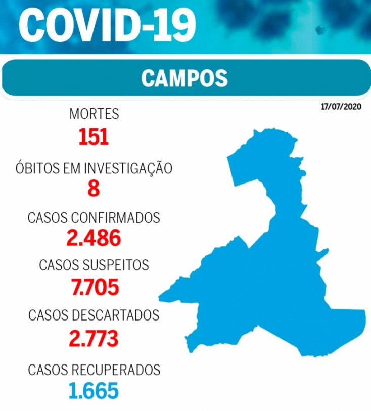 No dia 22, o óbito de um homem, de 72 anos, com comorbidades, por consequência do novo coronavírus, foi registrado pela Prefeitura de Campos.