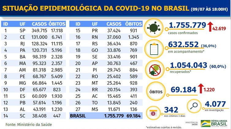 O número acumulado de óbitos teve aumento de 1,7% em relação a ontem, quando constavam 67.964 falecimentos pela doença. O painel do órgão também trouxe 42.619 novos casos. Com isso, o total acumulado de pessoas infectadas no país atingiu 1.755.779.