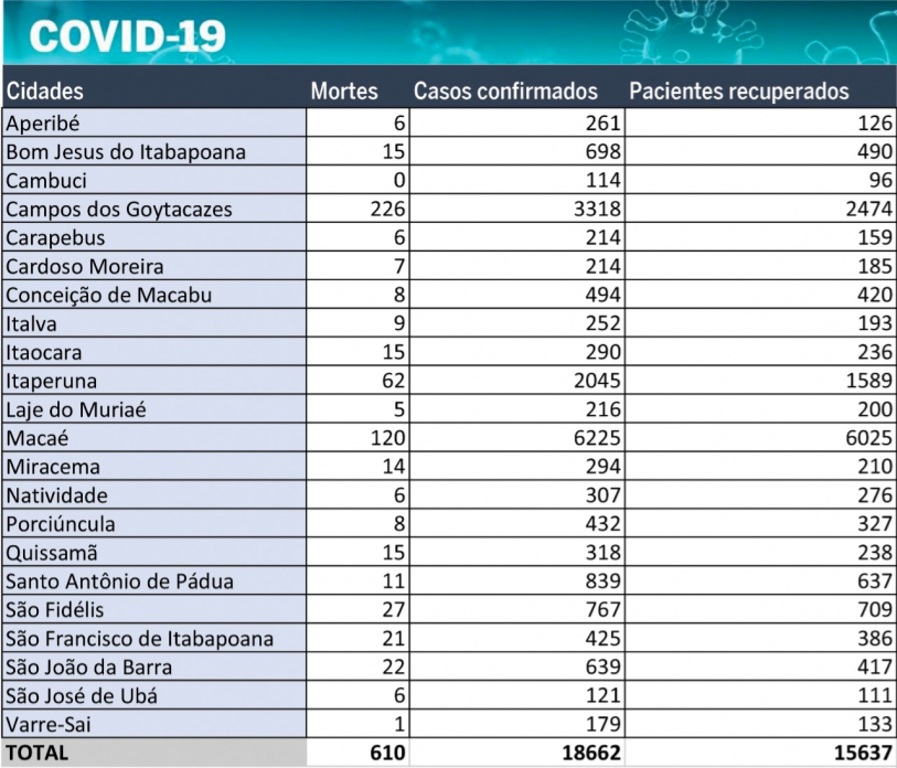 O Norte e Noroeste Fluminense confirmaram cinco mortes e 191 novos casos de Covid-19 nesta sexta-feira (7). Com esses números, as duas regiões contabilizam 610 óbitos e 18.662 pessoas infectadas desde o início da pandemia. Ao todo, 15.637 pacientes já estão recuperados.
