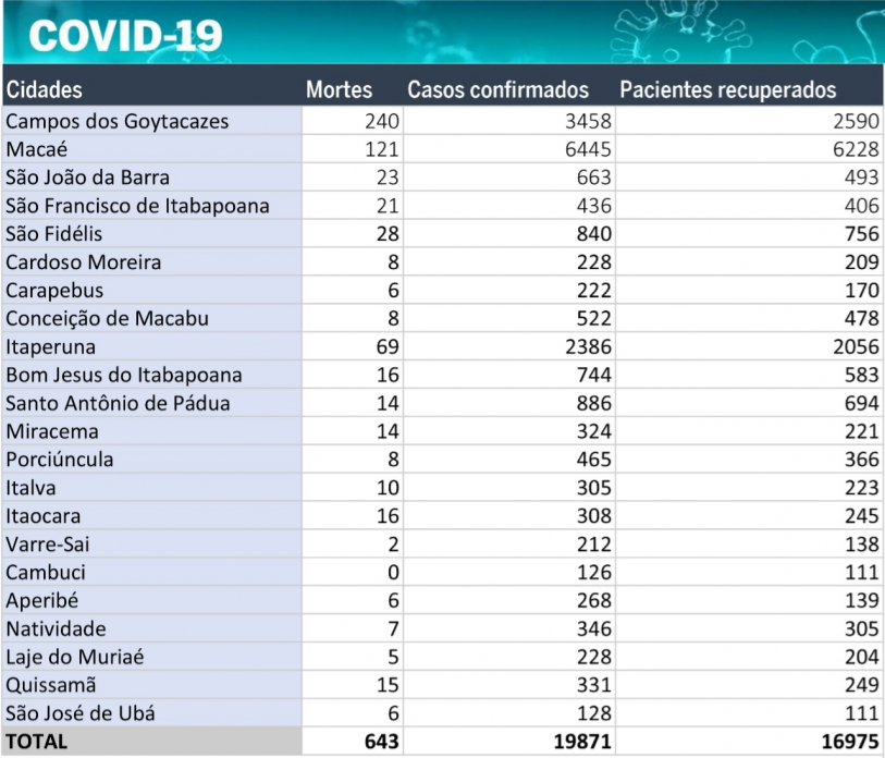 Os municípios do Norte e Noroeste Fluminense registraram, nesta terça-feira (11), novas mortes e casos positivos de Covid-19. Com as atualizações, as duas regiões, agora, contabilizam 643 óbitos em decorrência da doença e 19.871 pessoas infectadas pelo novo coronavírus, sendo que, dessas, 16.975 se recuperaram do vírus.