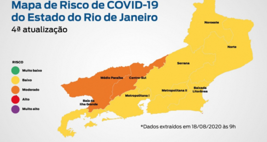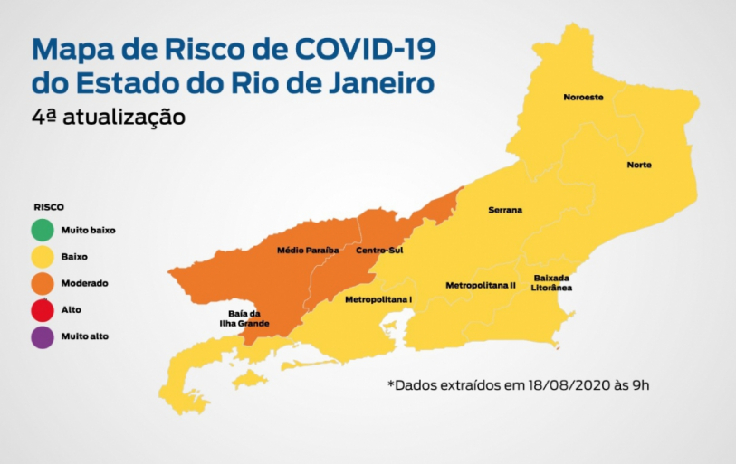 Do último Mapa de Risco, publicado em 4 de agosto, para o atual, as regiões Baía de Ilha Grande, Baixada Litorânea, Noroeste e Serrana avançaram da bandeira laranja (indicativo de risco moderado) para a amarela. Já o Médio Paraíba manteve a cor laranja por causa da variação positiva no número de óbitos por Síndrome Respiratória Aguda Grave (SRAG); e o Centro-Sul Fluminense, que estava amarelo, retornou à bandeira laranja devido à variação positiva do tanto do número de casos quanto de óbitos por SRAG. O nível de risco para o estado, como um todo, é baixo, indicado pela bandeira amarela.