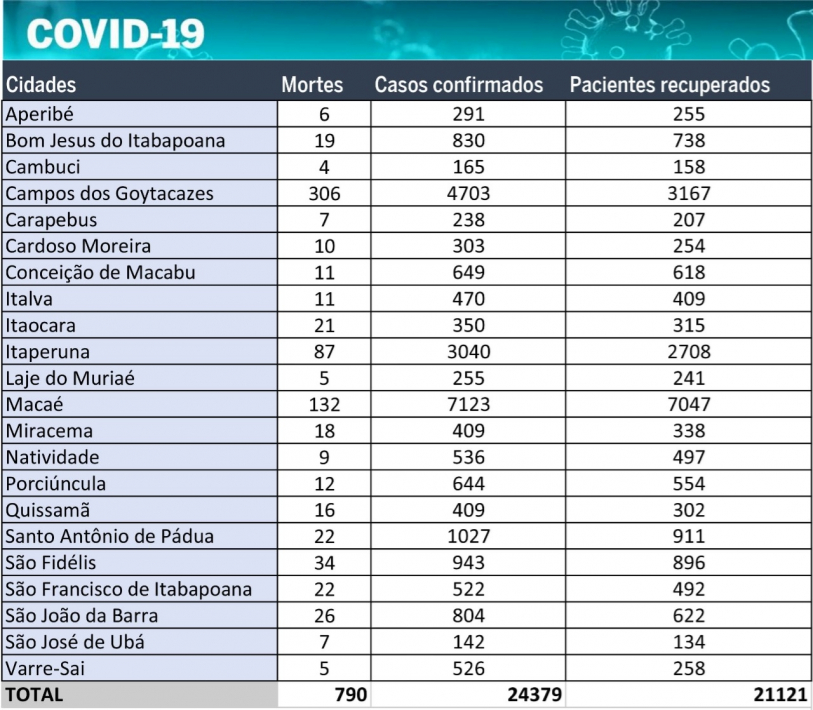 Os municípios do Norte e Noroeste Fluminense registraram 13 mortes e 496 novos casos positivos de Covid-19 nesta segunda-feira (31). As regiões totalizam 790 óbitos e 24.379 pessoas infectadas pelo novo coronavírus. Do total de confirmações, 21.121 pacientes se recuperaram da infecção.