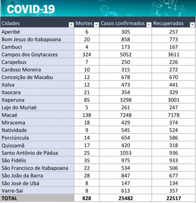 Os municípios do Norte e Noroeste Fluminense contabilizam, nesta terça-feira (08), 828 mortes em decorrência do novo coronavírus, desde o início da pandemia. Nos 22 municípios, 25.482 casos de Covid-19 já foram registrados. Já o número de pacientes recuperados chega a 22.517.