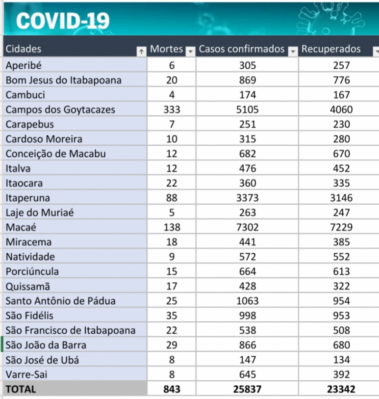 Os municípios do Norte e Noroeste Fluminense contabilizam, nesta quinta-feira (10), 843 mortes em decorrência do novo coronavírus, desde o início da pandemia. Nos 22 municípios, 25.837 casos de Covid-19 já foram registrados. Já o número de pacientes recuperados chega a 23.342.