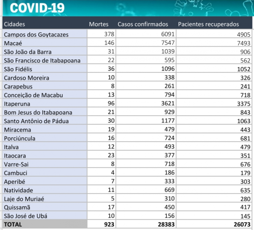 Os municípios do Norte e Noroeste Fluminense contabilizam, nesta quarta-feira (30), 923 mortes em decorrência do novo coronavírus, desde o início da pandemia. Nos 22 municípios, 28.383 casos de Covid-19 já foram registrados. Já o número de pacientes recuperados chega a 26.073.