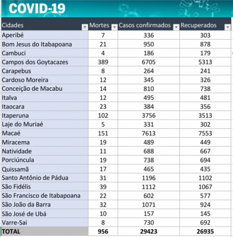 Os municípios do Norte e Noroeste Fluminense contabilizam, nesta terça-feira (06), 956 mortes em decorrência do novo coronavírus, desde o início da pandemia. Nos 22 municípios, 29.423 casos de Covid-19 já foram registrados. Já o número de pacientes recuperados chega a 26.935.