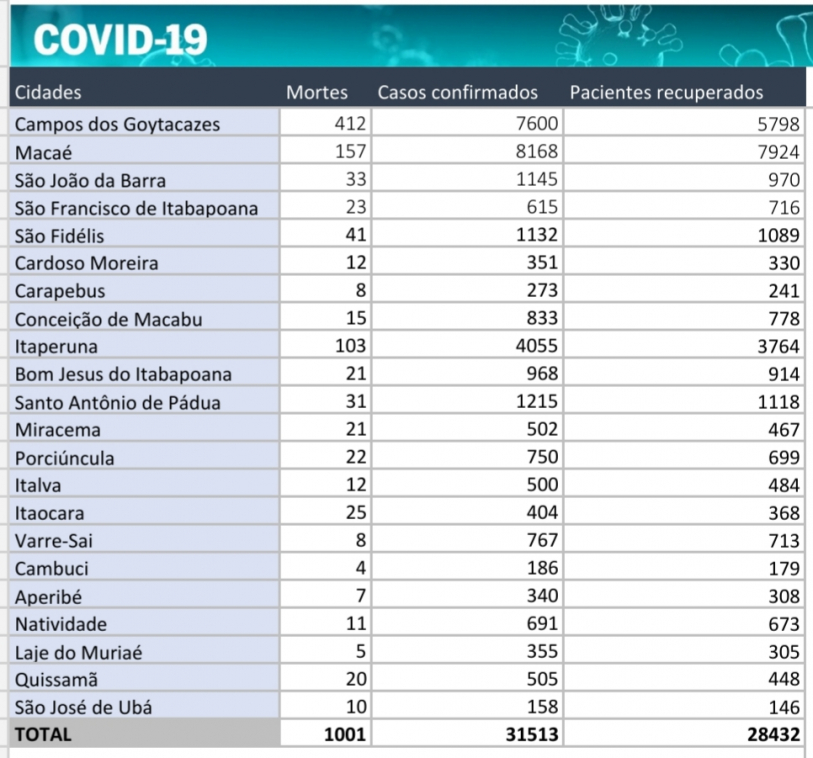 As cidades do Norte e Noroeste Fluminense ultrapassaram mil mortes por Covid-19 nesta sexta-feira (16). As duas regiões somam 1.001 óbitos em decorrência do novo coronavírus, desde o início da pandemia. Nos 22 municípios, 31.513 casos de Covid-19 já foram registrados. Destes, 28.432 já se recuperaram.