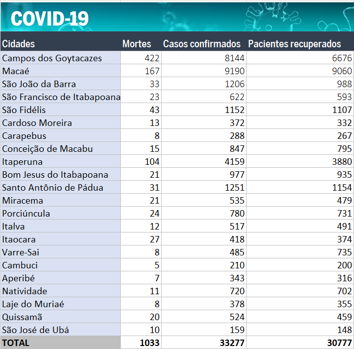 O Norte e o Noroeste Fluminense totalizam 1.033 óbitos em decorrência da Covid-19 desde o início da pandemia. Três deles foram registrados neste sábado (24), sendo dois em Campos e um em Macaé. Os casos confirmados nas regiões são ao todo 33.277, enquanto 32.777 pessoas já se recuperaram da doença.