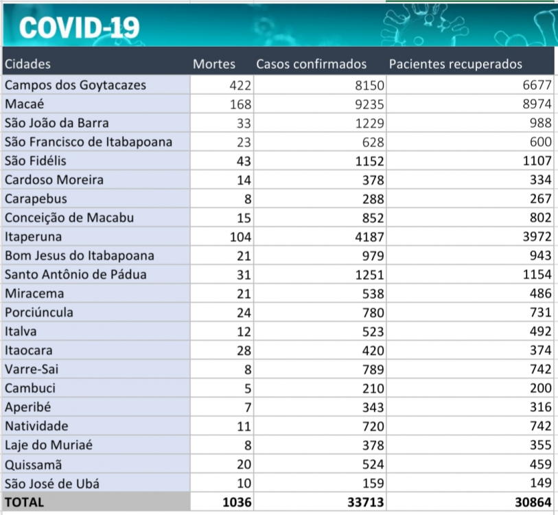 O Norte e o Noroeste Fluminense registraram, nesta segunda-feira (26), novos casos e mortes por coronavírus. No total, as duas regiões somam 1.036 mortes, 33.713 pessoas infectadas pela Covid-19 e 30.844 recuperados.