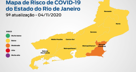 A subsecretaria Extraordinária de Covid-19 divulgou nesta quarta-feira (4) a nona edição do Mapa de Risco da Covid-19. Nele, o estado do Rio permanece classificado em bandeira amarela, que representa baixo risco da doença. Apenas uma das nove regiões do estado apresenta risco moderado, com bandeira laranja: a Baixada Litorânea. Nessa região vivem 6,68% da população do estado.