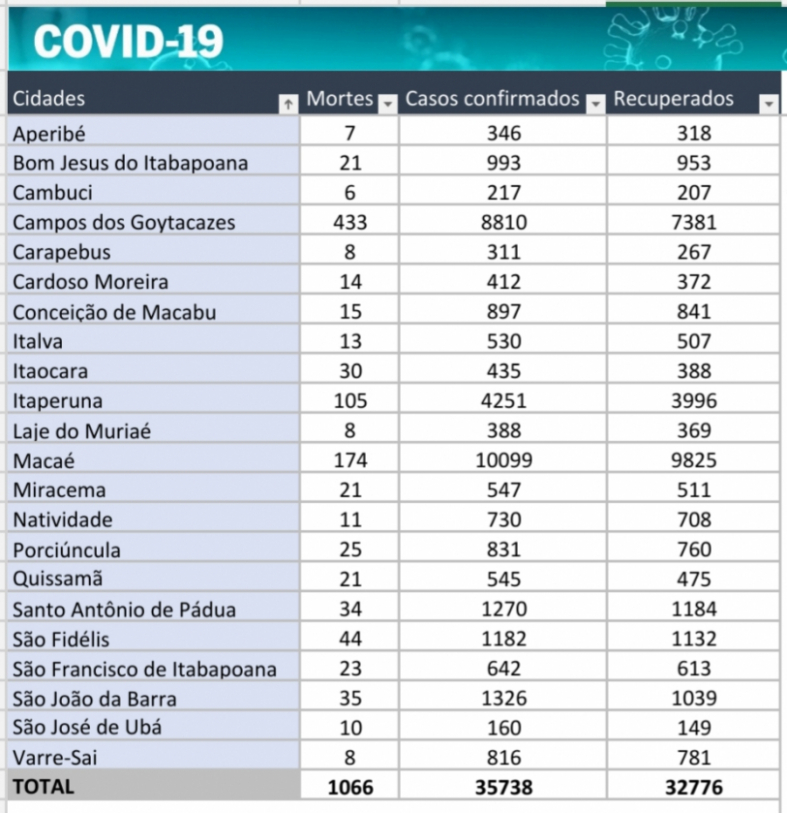 O Norte e o Noroeste Fluminense registraram, nesta quinta-feira (05), novos casos e mortes por coronavírus. No total, as duas regiões somam 1.066 mortes, 35.738 pessoas infectadas pela Covid-19 e 32.776 já se recuperaram do vírus.