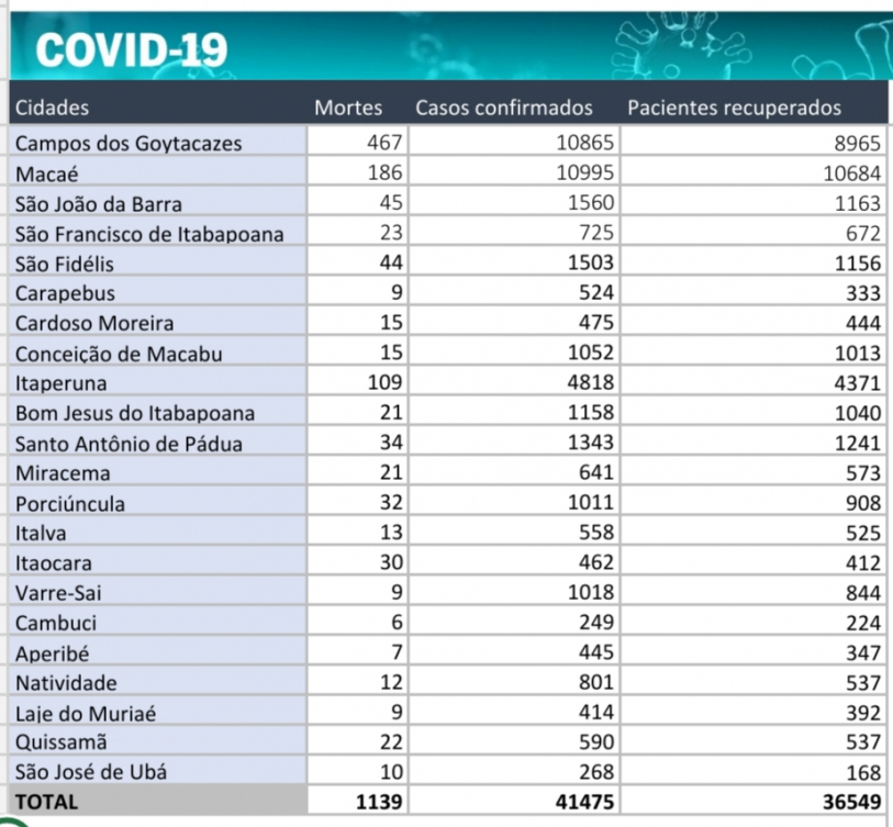 O Norte e o Noroeste Fluminense registraram, nesta sexta-feira (27), novos casos e mortes por coronavírus. No total, as duas regiões somam 1.139 mortes, 41.475 pessoas infectadas pela Covid-19 e 36.549 já se recuperaram do vírus.