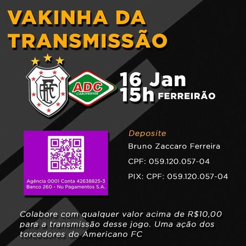 Como os jogos da Seletiva vão acontecer com portões fechados em razão da pandemia da Covid-19 e ainda não há definição sobre os direitos de transmissão do Campeonato Estadual, torcedores do Americano lançaram uma vaquinha com intuito de que a estreia do clube seja transmitida na internet. É possível colaborar com qualquer valor a partir de R$ 10, via depósito bancário ou transferência PIX.