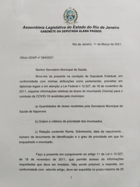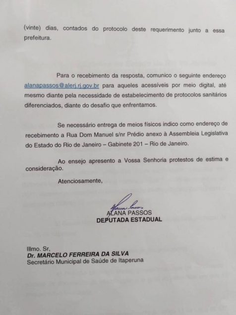 A deputada estadual Alana Passos, do PSL-RJ, quer saber da Prefeitura de Itaperuna quais foram as pessoas vacinadas contra o Coronavírus. Para isso ela protocolou um oficio.