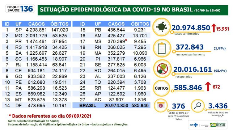 O número de pessoas que teve o diagnóstico de covid-19 desde o início da pandemia atingiu 20.974.850. Em 24 horas, as autoridades de saúde confirmaram 15.951 novos diagnósticos.