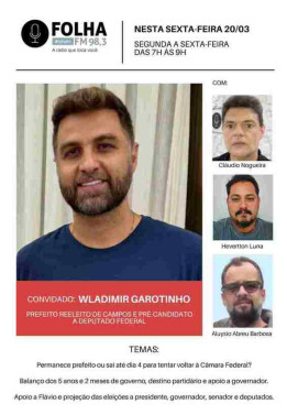 Prefeito reeleito de Campos em turno único e pré-candidato a deputado federal, Wladimir Garotinho (hoje, PP), é o convidado para fechar a semana do Folha no Ar desta sexta (20), na Folha FM 98,3.