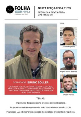 Cientista político, estrategista eleitoral, analista político do Metrópoles, Estadão e Record, e diretor do instituto de pesquisa Real Time Big Data, Bruno Soller é o convidado do Folha no Ar deste terça (31), ao vivo, na Folha FM 98,3.