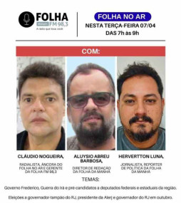 Esses serão os temas em debate no Folha no Ar desta terça (7), ao vivo, a partir das 7h da manhã, na Folha FM 98,3, entre o radialista Cláudio Nogueira e os jornalistas Aluysio Abreu Barbosa e Hevertton Luna.