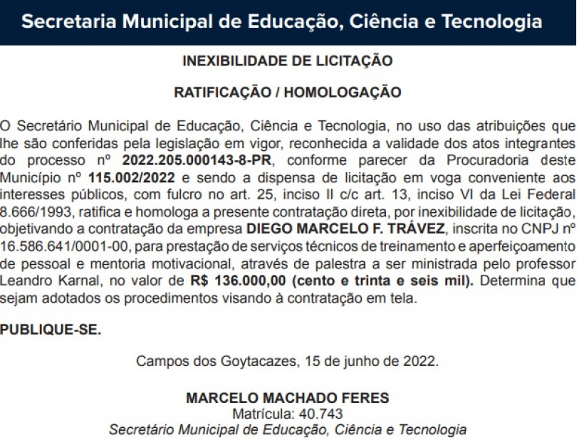 aqui) nessa terça-feira (21) que Leandro Karnal — professor, escritor, historiador e doutor em História Social — estará no município em agosto para uma palestra para os profissionais da rede municipal de ensino. No dia seguinte, o Diário Oficial do município traz o valor pago: R$ 136 mil à empresa “Diego Marcelo F. Trávez”. O alto valor chama atenção, mas poderia incluir parte da estrutura ou outro evento relacionado ao “Fórum Regional de Educação, Ciência e Tecnologia”. Na dúvida, ainda pela manhã, o blog consultou a Prefeitura, que respondeu mais de seis horas depois: “Trata-se de contratação do palestrante”. Ainda de acordo com a administração municipal, “o processo de contratação respeita todos os requisitos legais e cumpre os ritos administrativos regulares”.