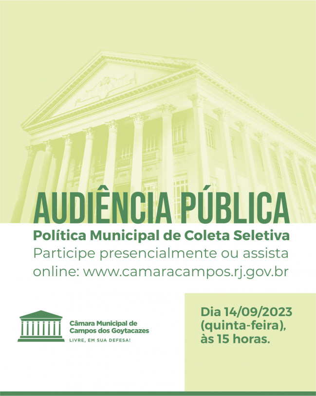 Por requerimento do vereador Fred Machado (Cidadania), que é presidente da Comissão de Obras e Serviços Públicos, a Câmara Municipal de Campos fará uma audiência pública com o tema “Política Municipal de Coleta Seletiva”, nesta quinta-feira (14), às 15h, no plenário do Palácio Nilo Peçanha.