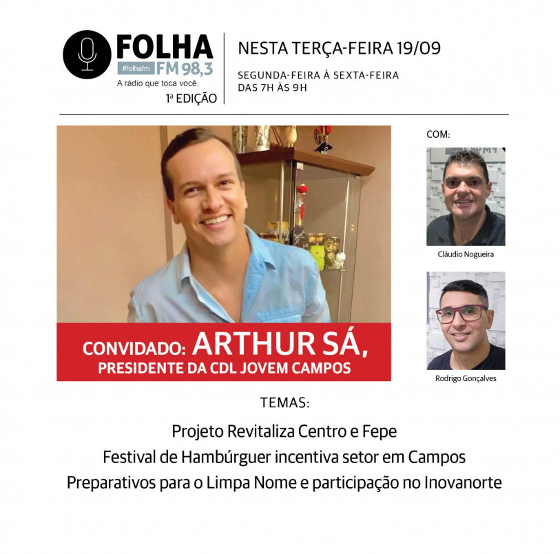 O Folha no Ar desta terça-feira (19) recebe, a partir das 7h, o presidente da Câmara de Dirigentes Lojistas Jovem (CDL Jovem) de Campos, Árthur Sá. No programa da Folha FM 98,3, vários assuntos estarão em pauta, como o Projeto Revitaliza Centro, que aos sábados tem movimento o comércio da área central com atrativos. Além disso, ele falará sobre outras inciativas como a 32ª edição da Feira de Preços Especiais (Fepe), que será realizada de 5 a 8 de outubro.