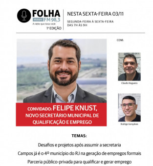 O feriadão é prolongado para muitos, mas para o Folha no Ar a sexta-feira (3) é dia de entrevista. Quem estará, ao vivo, a partir das 7h, no programa da Folha FM 98,3, é o novo secretário de Qualificação e Emprego de Campos, Felipe Knust, à frente do cargo oficialmente desde o último dia 26, quando foi exonerado seu antecessor Robson Barboza, que ocupava a vaga pela oposição dentro de um acordo de pacificação entre os Garotinhos e Bacellar, que chegou ao fim (aqui).