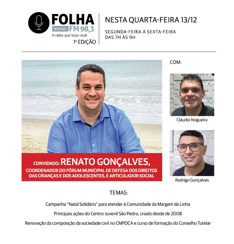 Articulador do Centro Juvenil São Pedro, que atende a cerca 140 crianças e adolescentes da Margem da Linha, e coordenador do Fórum Municipal de Defesa dos Direitos das Crianças e dos Adolescentes, Renato Gonçalves é o entrevistado da Folha no Ar desta quarta-feira (13). Ele está, ao vivo, no programa da Folha FM 98,3, falando da Campanha de “Natal Solidário“ do Centro Juvenil, cujo objetivo é contar com a colaboração da sociedade para a arrecadação de brinquedos.