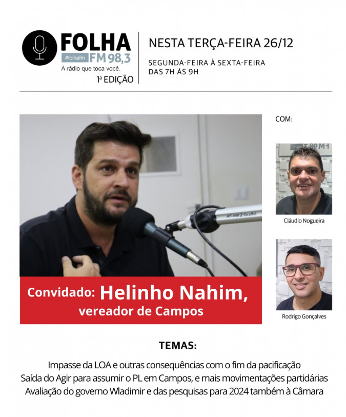 A pouco mais de 9 meses para as eleições municipais, Helinho falará também sobre as composições. Como mostrou o Blog Opiniões (aqui), do jornalista Aluysio Abreu Barbosa, na Folha 1, o vereador de oposição e pré-candidato à reeleição na Câmara vai assumir em Campos o PL do ex-presidente Jair Bolsonaro. Também analisará a gestão do primo e prefeito de Campos Wladimir Garotinho (PP) e as pesquisas de intenção de votos para 2024 à Prefeitura e à Câmara, ainda com as avaliações de governo e do Legislativo municipal.