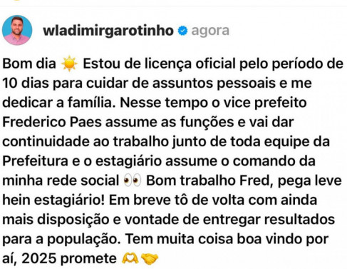 Segundo Wladimir, o motivo do afastamento é para cuidar de assuntos pessoais e se dedicar à família. O prefeito ficará ausente até o dia 16 de março.