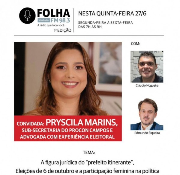 O Folha do Ar desta quinta-feira (27), trará Pryscila Marins, subsecretária do Procon Campos e advogada com experiência eleitoral. Ela falará sobre a figura jurídica do “prefeito itinerante”, e fará suas observações sobre as eleições de 6 de outubro, além da participação feminina na política. A advogada falará ainda sobre a atuação do Procon Campos