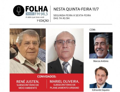 René Justen e Mariel Oliveira, subsecretário de Meio Ambiente e subsecretário de Planejamento Urbano, respectivamente, são os convidados do Folha no Ar desta quinta (11), ao vivo, a partir das 7h da manhã, na Folha FM 98,3.