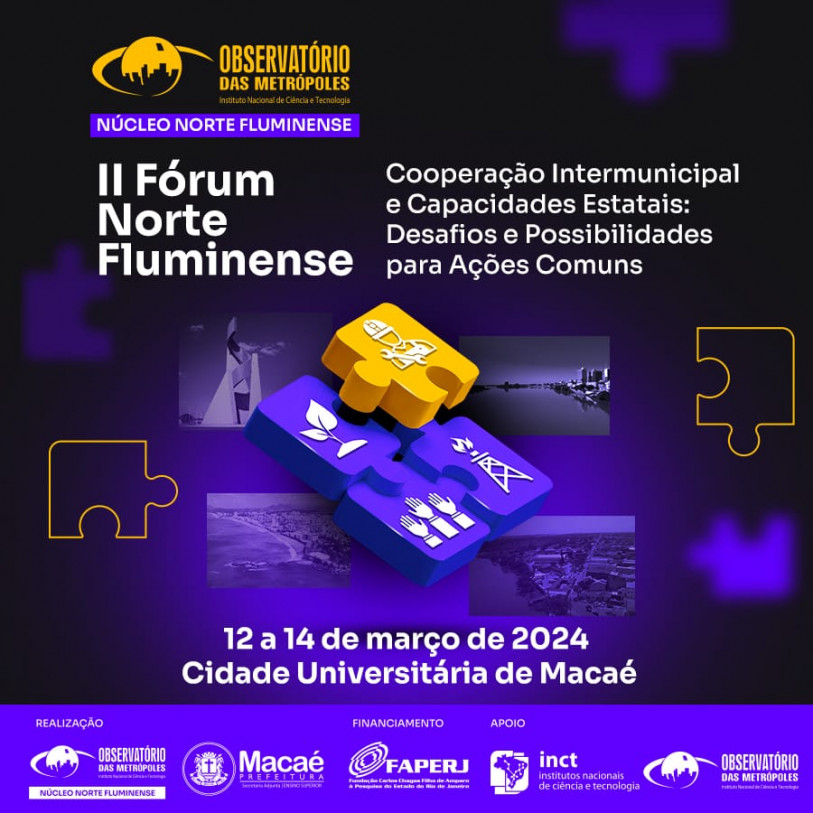 Com a chegada do período eleitoral nos municípios, alguns eventos criam espaços para debater o atual curso e o futuro das cidades. Um deles está previsto para acontecer de 12 a 14 de março, na cidade de Macaé. Trata-se do II Fórum Norte Fluminense “Cooperação Intermunicipal e Capacidades Estatais: Desafios e Possibilidades para Ações Comuns” sediado no Pólo Universitário. O evento é organizado pelo Núcleo Norte Fluminense do INCT Observatório das Metrópoles, que integra pesquisadores da UENF, UFF, IFF, UCAM e UFRJ. A atividade conta com apoio da FAPERJ e é realizada em parceria com a Subsecretaria de Educação de Macaé.