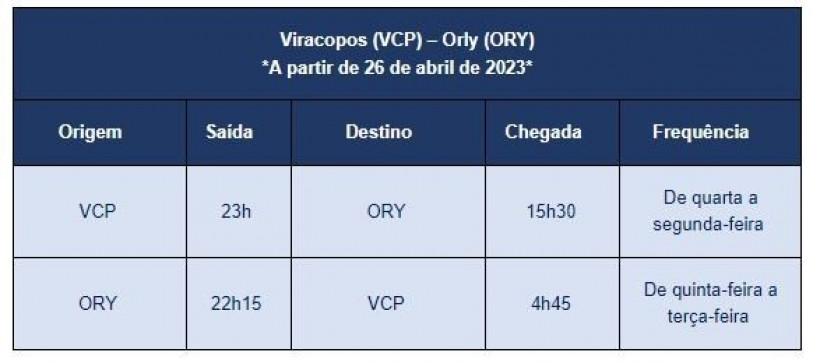 Serão 6 frequência semanais, partindo de Viracopos às 23h00 e chegando em Paris às 15h30. No sentido inverso o voo decolará de Orly às 22h15, aterrisando em Campinas às 04h45. O avião será um Airbus A350, com capacidade pra 334 passageiros, sendo 301 na classe econômica e 33 na executiva.