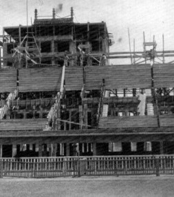 Anos 50. Duas imagens de construções simultâneas na Rua dos Goytacazes (antiga Rua do Gás). No primeiro plano, a da arquibancada social do Estádio Ary de Oliveira e Souza, do Goytacaz. Atrás, a construção do primeiro edifício de Campos.
