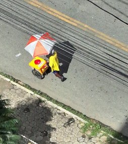O vendedor da foto circula quase todos os dias pela Rua Ipiranga, área central de Campos. O seu grito “olha o picolé aííí..." já é conhecido. O fato novo é que, de uns tempos para cá, colocou um guarda sol na carrocinha.