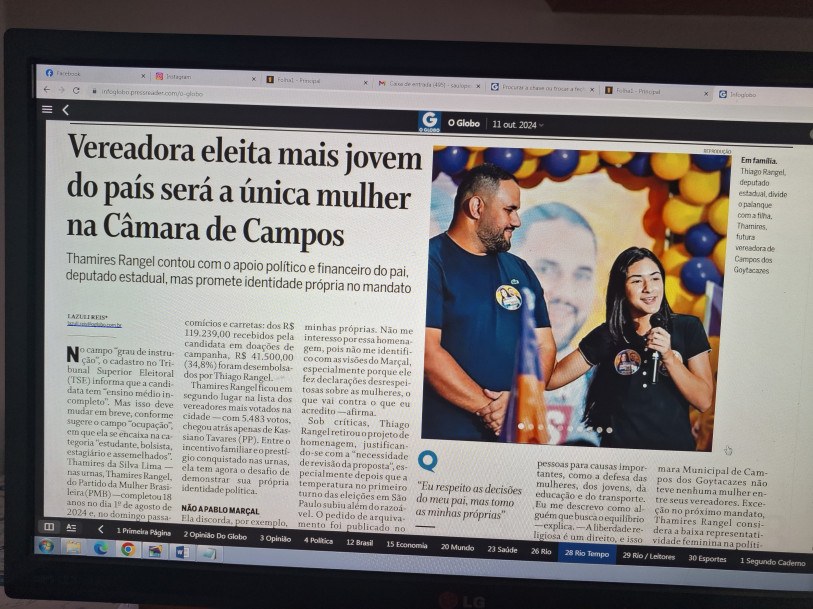Vereadora mais jovem eleita no Brasil — completou 18 anos no dia 1º de agosto de 2024 — Thamires Rangel, única mulher a conquistar uma cadeira na Câmara Municipal de Campos nas eleições deste ano, é destaque hoje, em matéria no Globo.