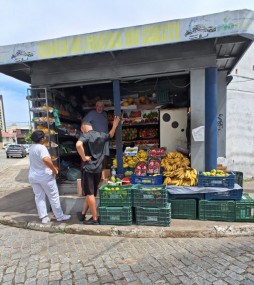 No espaço, atrás do Edifício Salete, e da Fornecedora Jacyntho, já funcionou uma banca de jornais e revistas. Originalmente, a destinação era essa. Mas, hoje, com sucesso, porque a clientela é grande, o que se vê ali é um mini hortifruti, ou, quitanda, como se chamaria no passado. À frente, está seu Gerson. Ele colhe o fruto que planta (ou que vende). É simples: o bom atendimento faz com que o cliente volte. É o trabalho informal girando a roda da economia.