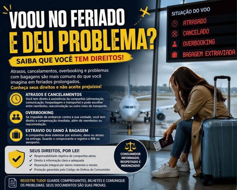 Viajar em feriados não precisa ser sinônimo de dor de cabeça. Conhecer seus direitos é o primeiro passo para transformar um problema em uma solução justa e, sobretudo, para equilibrar uma relação que, muitas vezes, é marcada pela vulnerabilidade do passageiro diante das grandes companhias aéreas.
