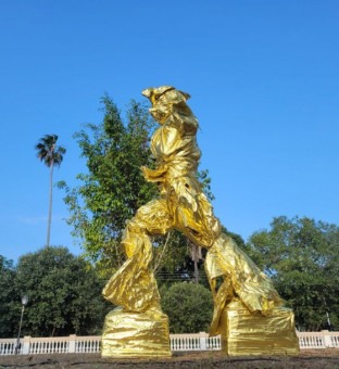 A performance de Mury ofereceu ao público interpretação. Ele encarna a escultura, vestido com um traje dourado especialmente desenhado que interage com o vento nordeste da planície para criar uma sensação de movimento e dinamismo. Esta interpretação ao vivo, foi pensada para ter uma duração de 15 minutos, no entanto, ele ficou por uma hora, no que conta, em uma pose desconfortável, no calor, imóvel… tudo para oferecer a experiência conceitual.